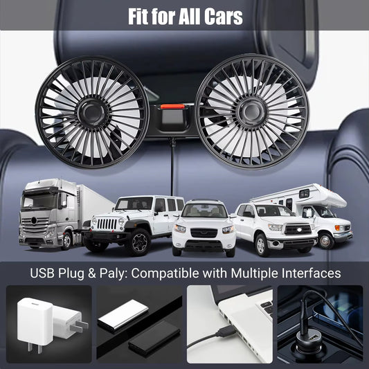 Car Fan for Backseat, USB Powered Dual Head Car Seat Fans, 360° Rotatable Car Window Fan, Powerful Air Circulation Car Rear Fan